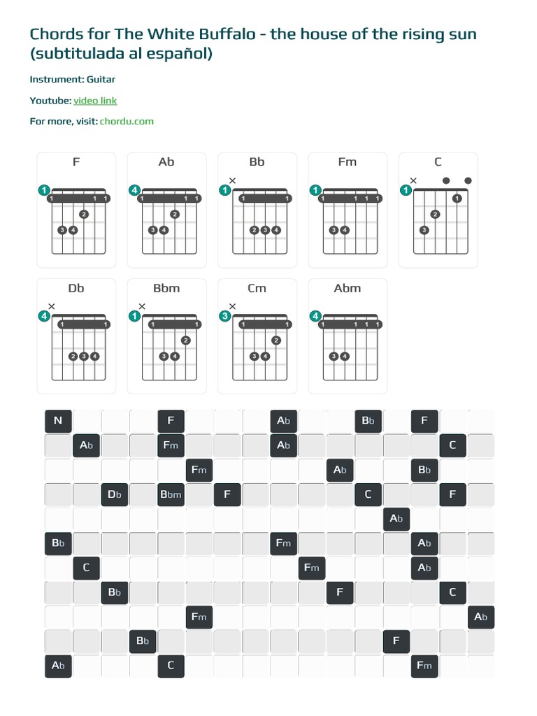 F Ab Bb Fm C Db Bbm Cm Abm Chords for The White Buffalo - House of the Rising Sun with song key BPM capo transposer play along with guitar piano ukulele mandolin. Fm Ab C7 Bbm.